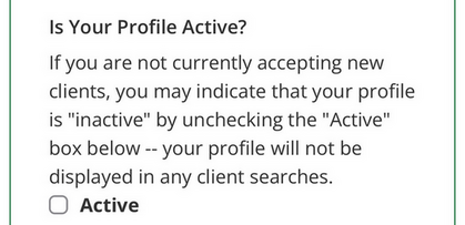 You may "de-activate" your therapist profile, for example, if you are no longer accepting clients, via the following steps. After logging in, edit your profile by selecting the "Edit profile" link above your avatar. Scroll down to the "Is Your Profile Active?" label, and un-check the Active checkbox so that it appears like the image below: